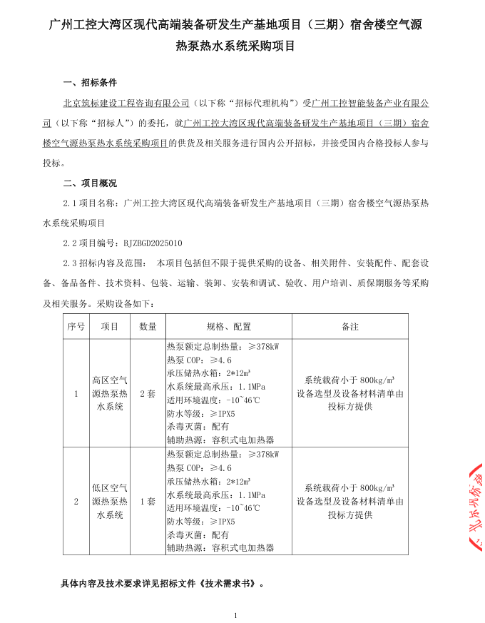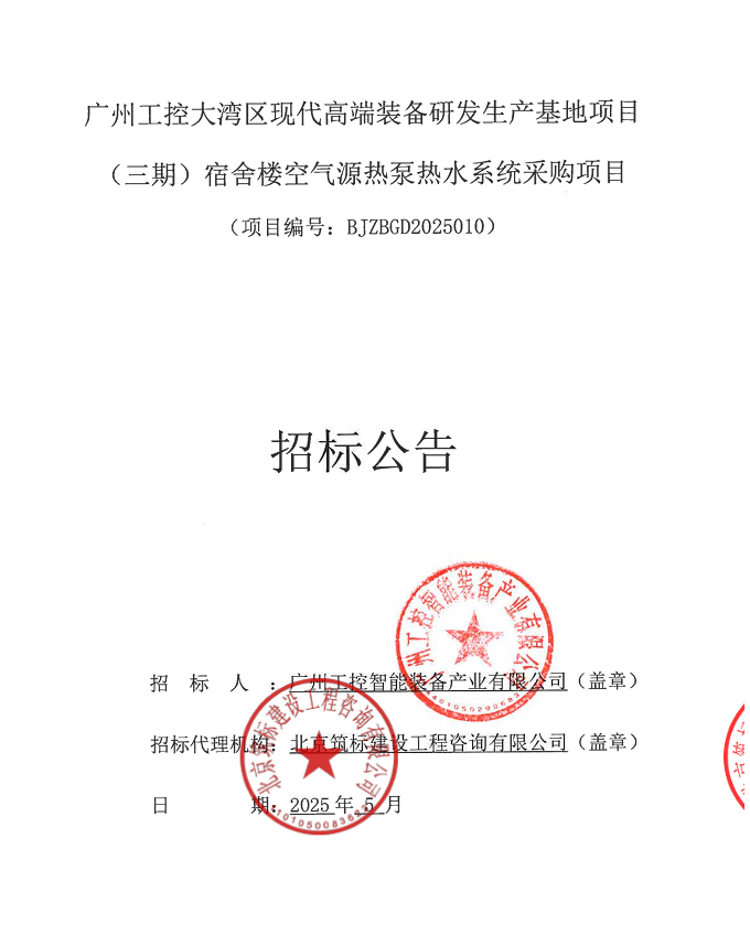 广州工控大湾区现代高端装备研发生产基地项目 (三期)宿舍楼空气源热泵热水系统采购项目招标公告