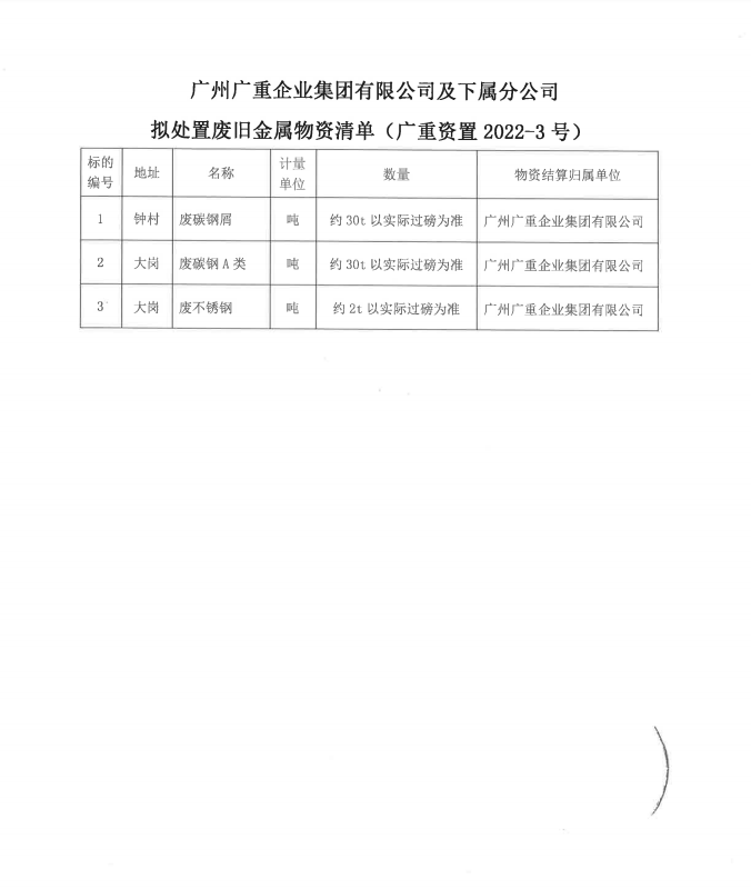 钟村、大岗基地废碳钢屑等物资处置(英超买球资置2022-3号)