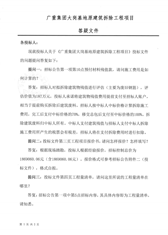 英超买球集团大岗一期原建筑物拆除工程项目招标答疑公告